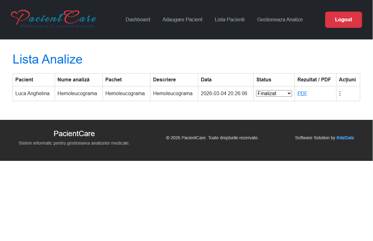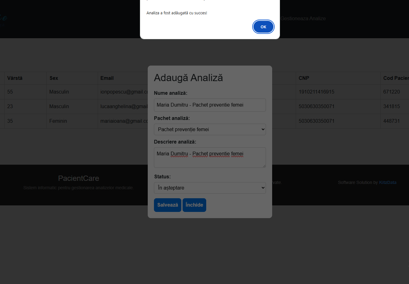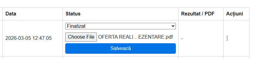 ✔ Actualizare status analiză (în lucru, finalizată etc.)